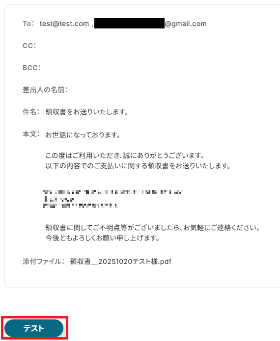 送信のプレビューが出ますので、確認して問題なければテストボタンをクリックします。