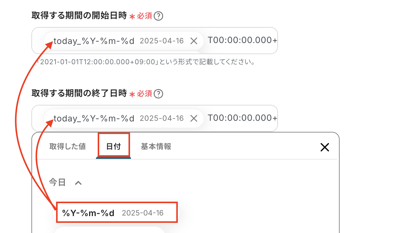 日付を選択したら、開始日時の日付のあとに、「半角スペース」と「T00:00:00.000+09:00」と入力して時間を設定しましょう。