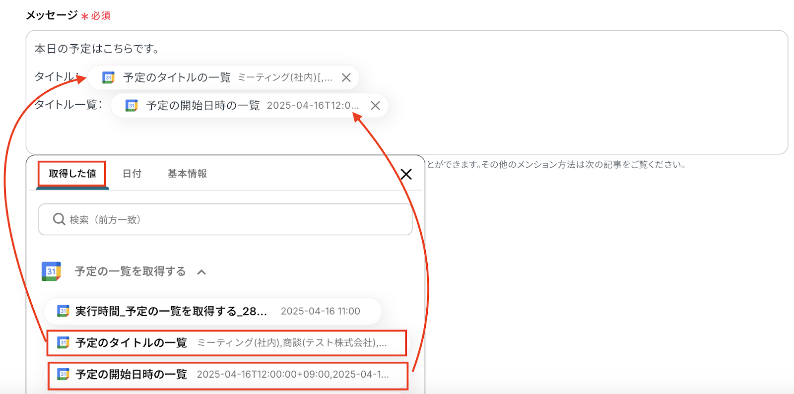 Googleカレンダーから取得した予定情報を、下図のようにアウトプットを用いて設定しましょう!
