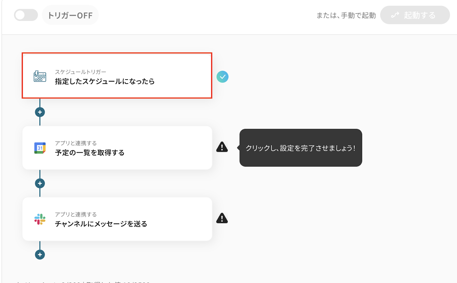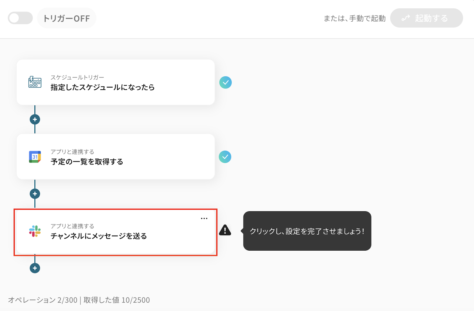 先ほど取得したGoogleカレンダーの予定情報を、Slackに自動通知する設定を行います。
