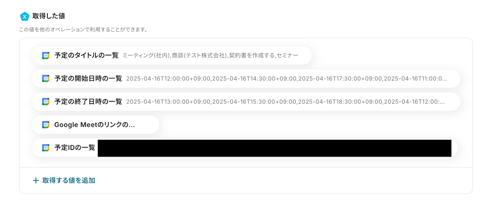 テストが成功すると、Googleカレンダーから予定情報がアウトプットとして取得されます。