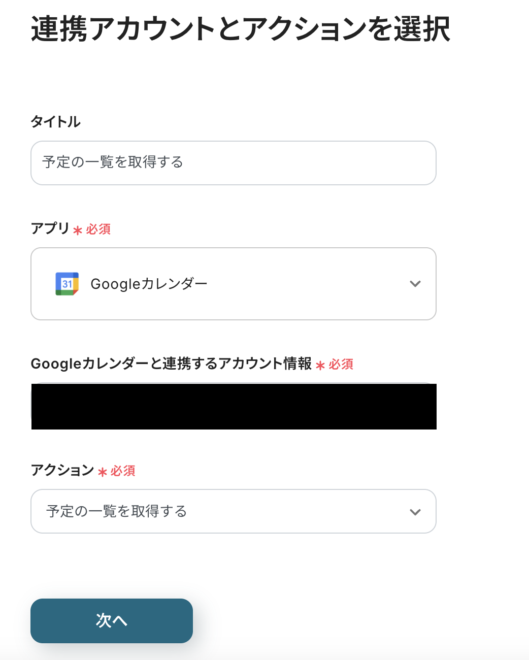 使用するGoogleカレンダーのアカウント情報を確認し、アクションは「予定の一覧を取得する」のままにして、「次へ」をクリックしましょう。
