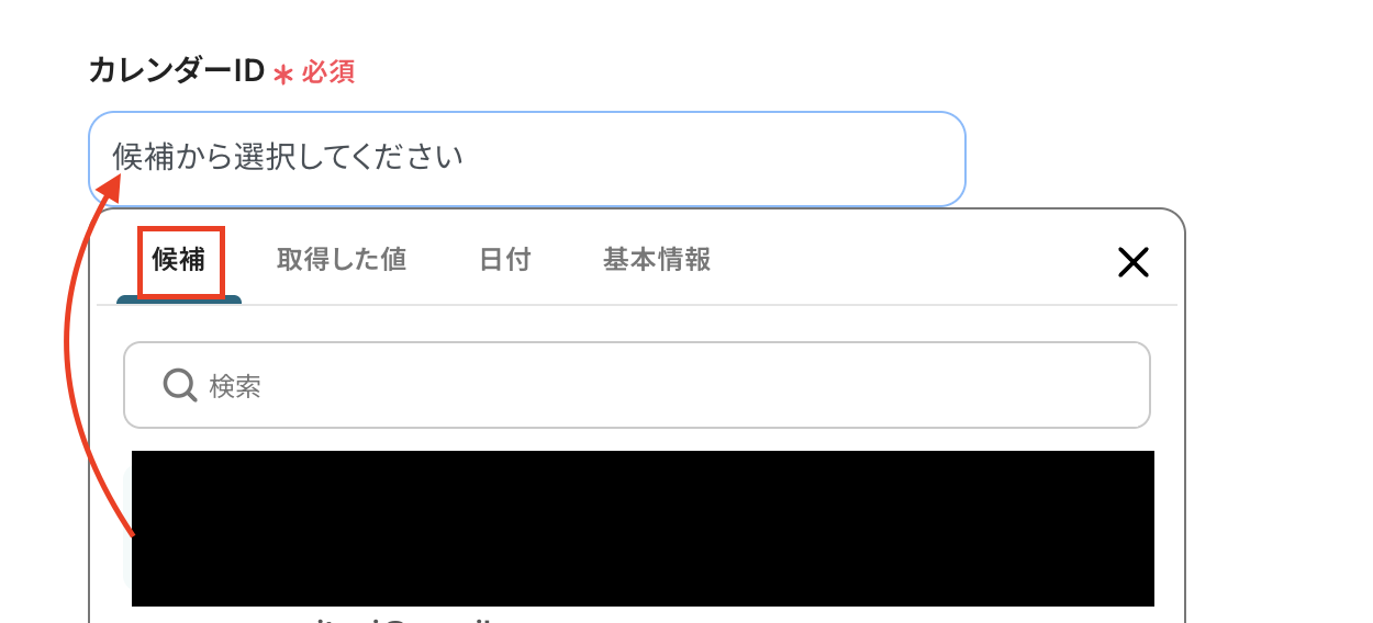 「カレンダーID」は候補から選択してください。入力欄をクリックすると、連携しているアカウントから候補が表示されます!