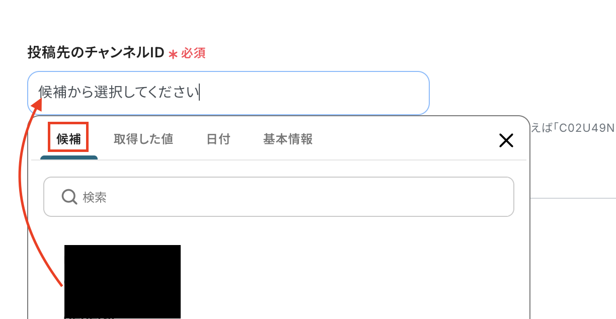 「投稿先のチャンネルID」を、入力欄をクリックして表示される候補から選択しましょう。
