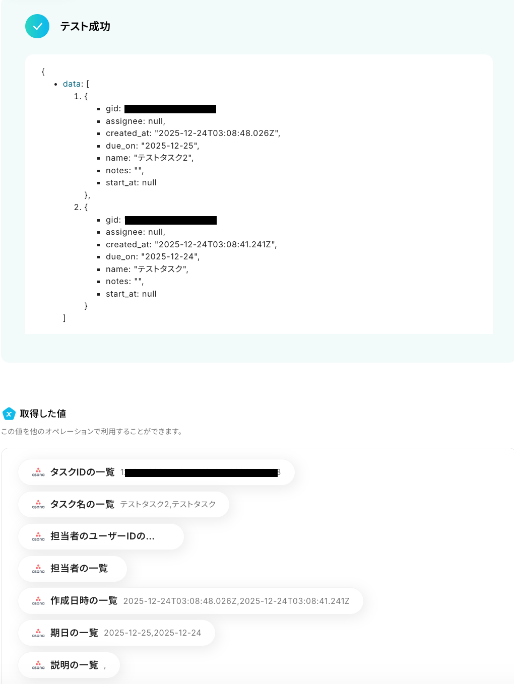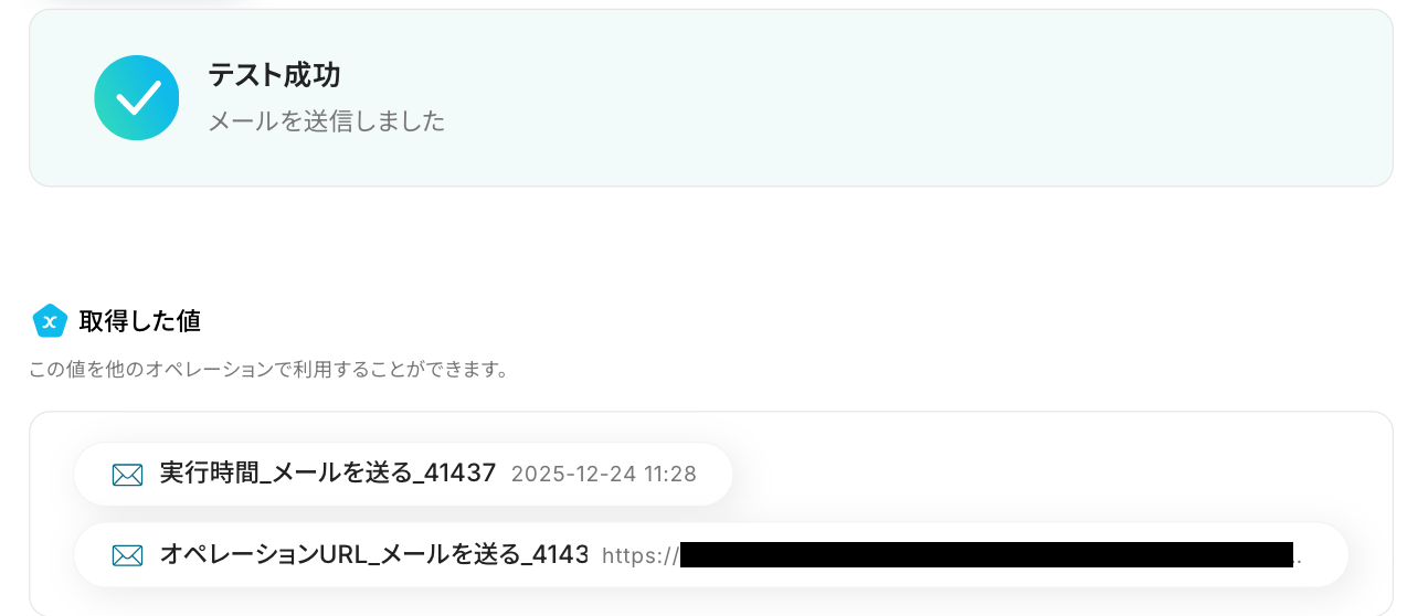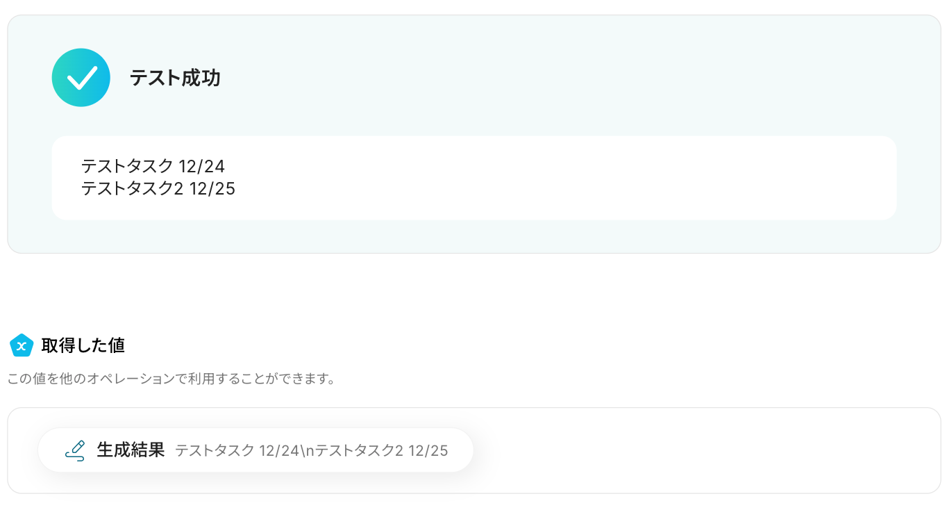 設定ができたら、「テスト」をクリックします。 テストが成功すると、取得した値が表示されます。問題がなければ、「完了」をクリックしましょう!