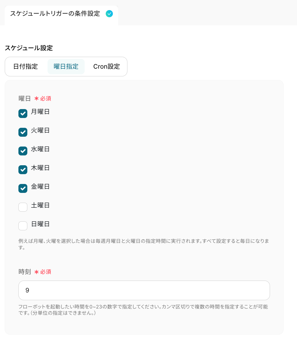 ここでは、「スケジュール設定」を行います。 フローボットを起動したい日付や時刻を自由に設定しましょう。今回は、コピーしたテンプレートの既存設定のままにします。 最後に「完了」をクリックしましょう!