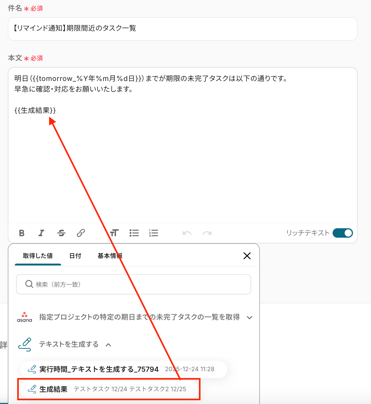 本文 :任意の文章を設定 ※任意で作成した文章とテキスト生成で取得した値を引用します。 自由に設定してください。 ※「日付変数」は入力欄をクリックすると表示されます。