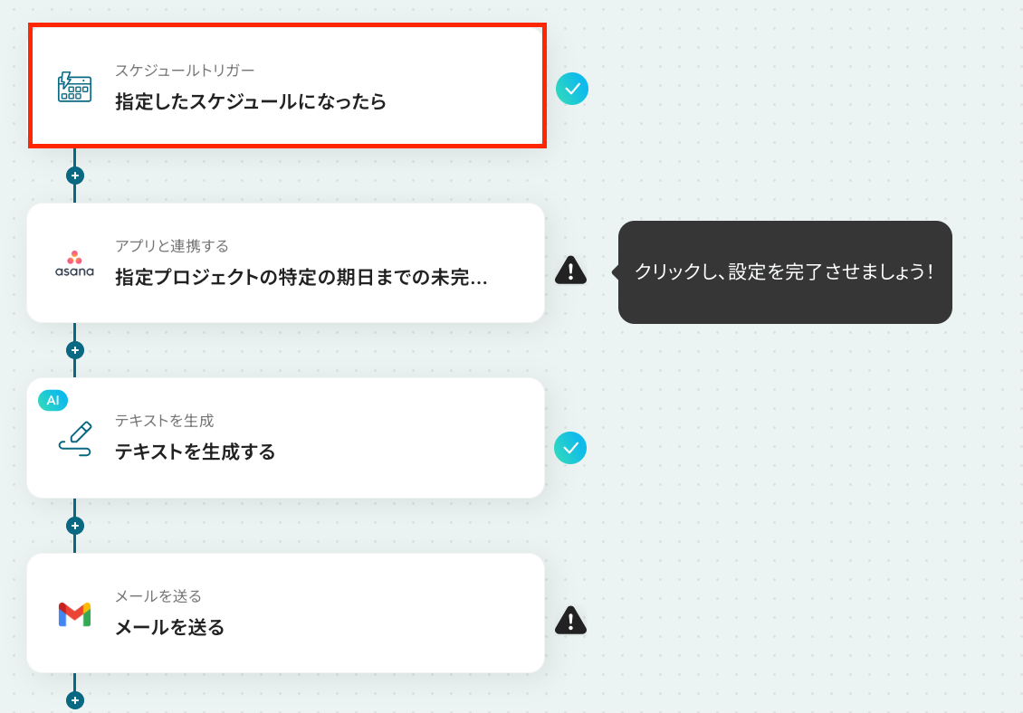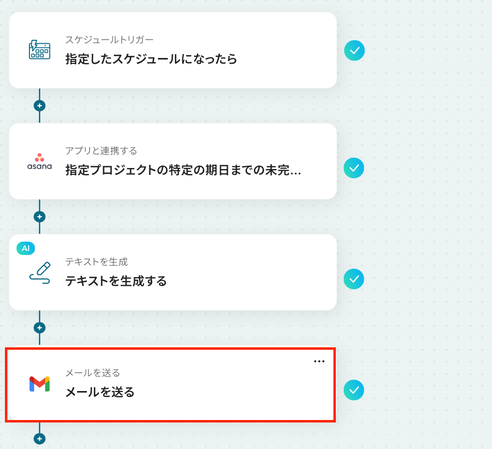 はじめに、AsanaとGmailをYoomと連携します。 次に、トリガーでスケジュールトリガーを選択し、「指定したスケジュールになったら」というアクションを設定して、リマインドを行いたい日時(例:毎朝9時)を指定します。 次に、オペレーションでAsanaを選択し、「指定プロジェクトの特定の期日までの未完了タスクの一覧を取得」アクションを設定します。 次に、オペレーションで「テキストを生成する」アクションを設定し、取得したタスク情報をもとにリマインドメールの本文を生成します。 最後に、オペレーションでGmailの「メールを送る」アクションを設定し、生成したテキストを本文に含めてメールを送信します。 ※「トリガー」:フロー起動のきっかけとなるアクション、「オペレーション」:トリガー起動後、フロー内で処理を行うアクション■このワークフローのカスタムポイント