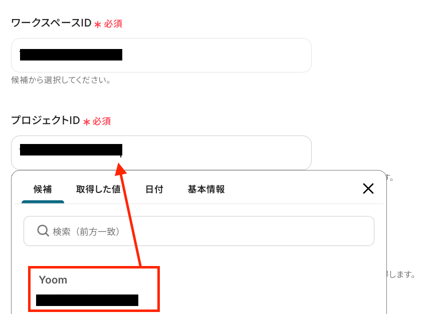 次の画面で必須項目を設定していきます! まずは、「ワークスペースID」 と「プロジェクトID」 を設定します。 入力欄をクリックして表示される候補から選択してください。