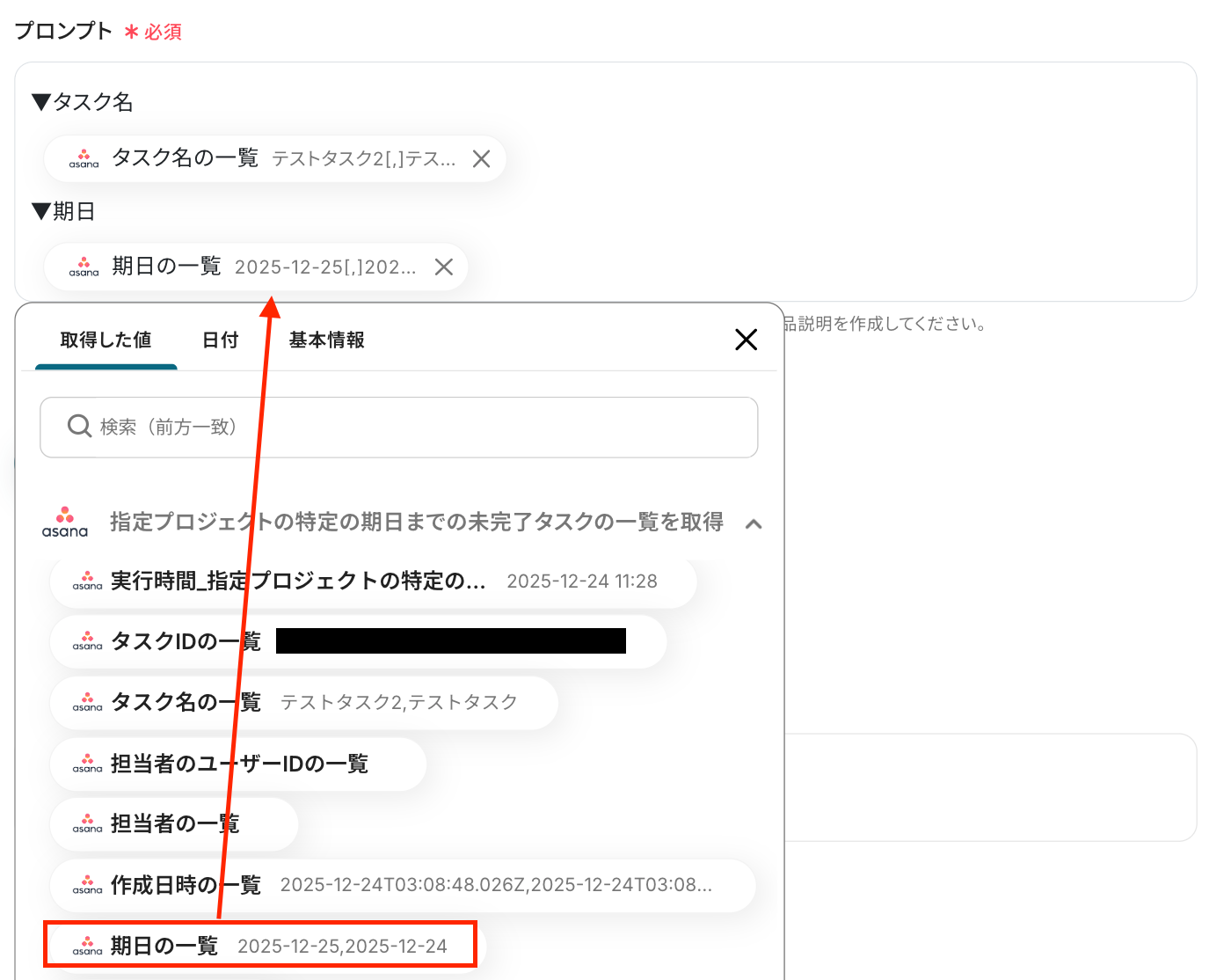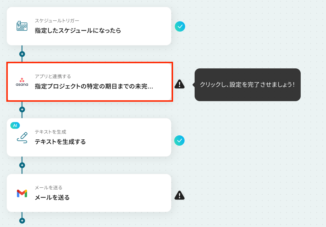 ステップ4:Asanaのアクション設定 ここでは、Asanaの期限が近い未完了タスクを取得する設定を行います。 以下の赤枠をクリックしてください。