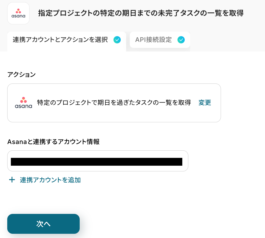 アクションはそのままで、連携するアカウント情報が間違っていないかを確認します。 確認後、「次へ」をクリックしましょう!