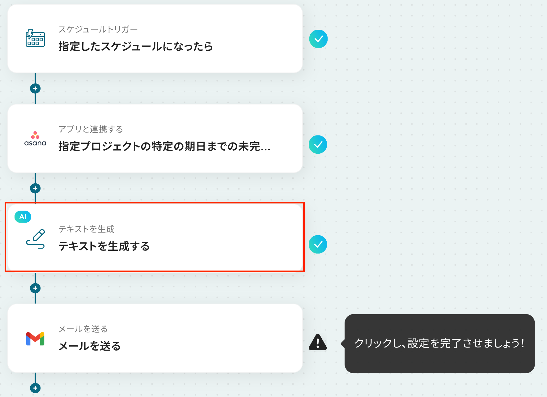 ステップ5:テキストを生成する設定 ここでは、生成AIを用いて、先ほど取得したタスクを日付の早い順に並び替える設定を行います。 以下の赤枠をクリックしてください。