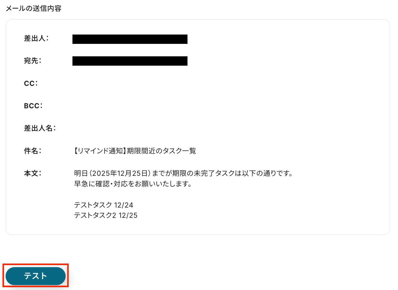 入力完了後、「次へ」をクリックしましょう! 次の画面で「メールの送信内容」を確認します。 宛先と本文に間違いがないかを確認し、「テスト」をクリックします。 ※テストをクリックすると、実際に「宛先」にメールが送信されるため、ご注意ください。