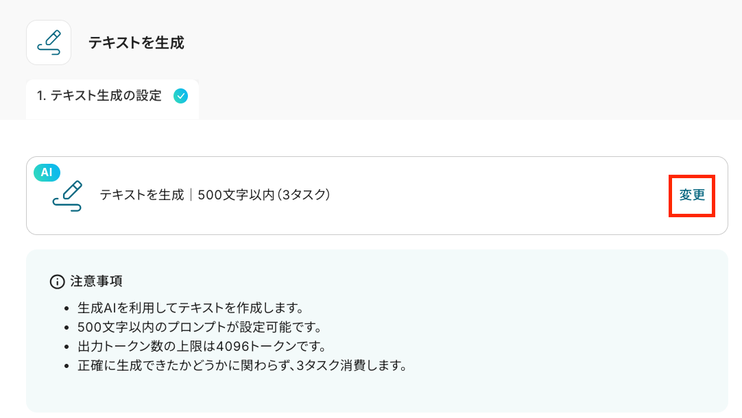 以下の画面が表示されるので、注意事項を確認しましょう。 赤枠部分の「変更」をクリックすると、「指示可能なプロンプトの文字数」 を変更できます。 詳細は以下のリンクをご確認ください。