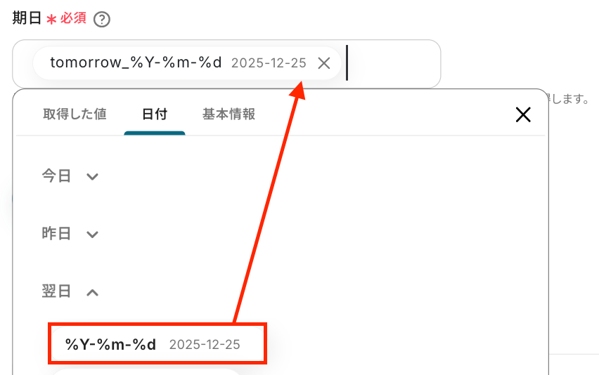 続いて、「期日」 を設定します。 今回は、入力欄をクリックして表示される「日付」を設定し、明日までの未完了タスクを取得するよう設定しました。