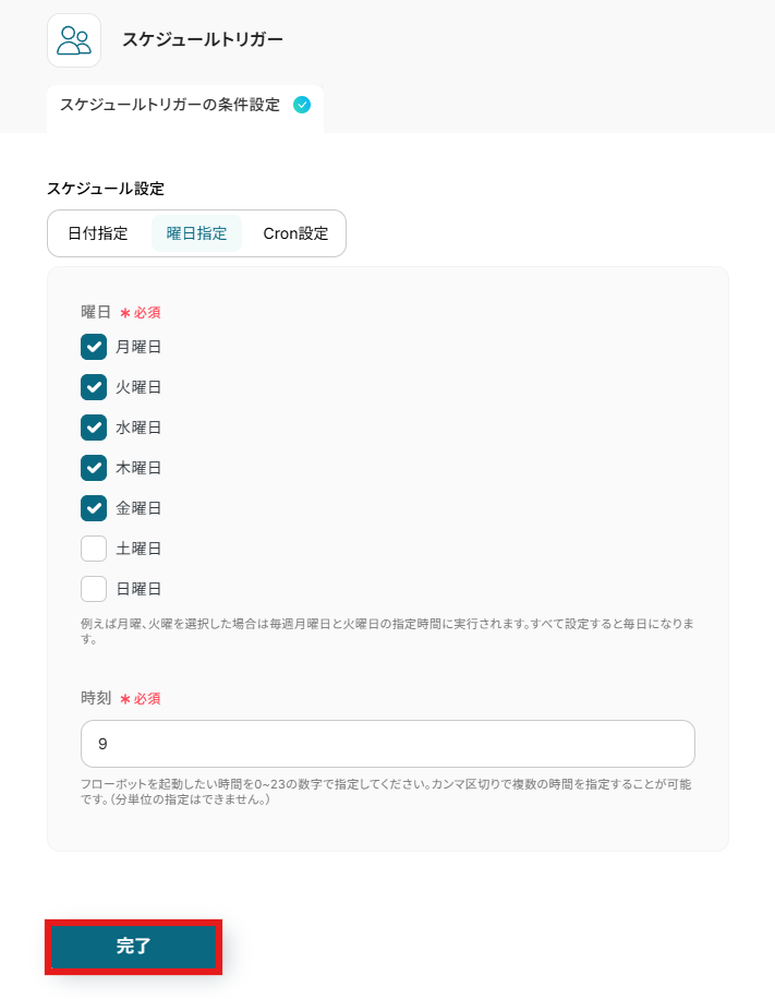 また、時刻の欄にはフローボットを起動したい時刻を0~23の数字で指定しましょう。