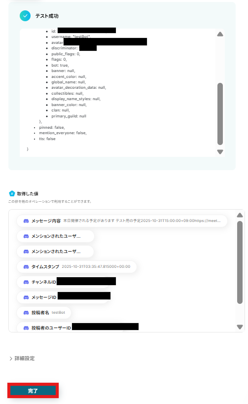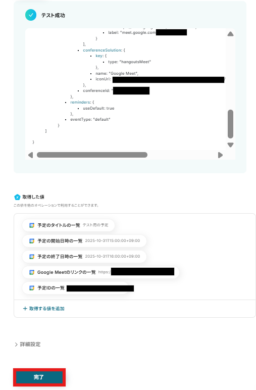 すべて入力できたら完了をクリックし、アプリトリガーの設定は完了です。