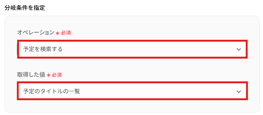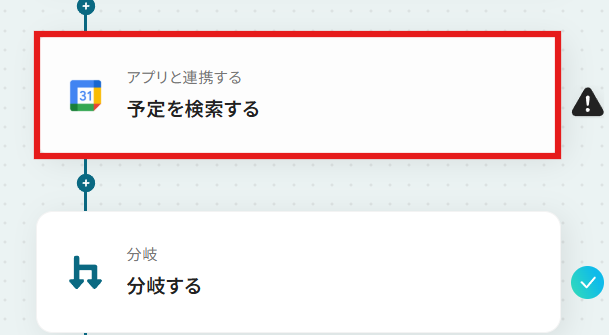 次に、Googleカレンダーで取得した予定が存在する場合のみ、後続のアクションが実行できるように分岐の設定を行いましょう。