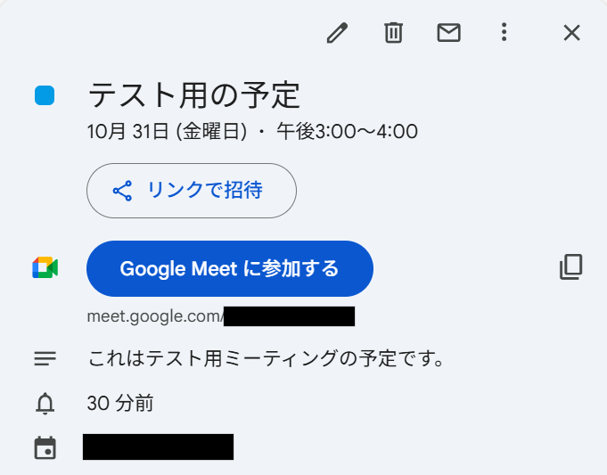 この後行う連携テストのために、連携したGoogleカレンダーのアカウントで予定を作成しておきましょう。