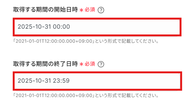 次に、「取得する期間の開始日時」と「取得する期間の終了日時」をそれぞれ入力します。