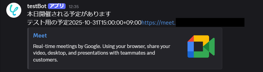 テストが成功すると、Discordでリマインドのメッセージが送信されていますので確認してみてください。