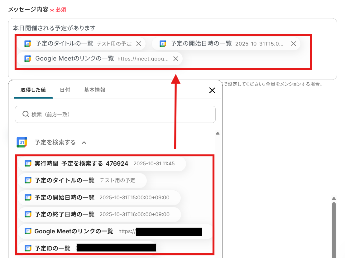 Googleカレンダーで予定を検索するアクション設定で取得した値を活用して入力しましょう。
