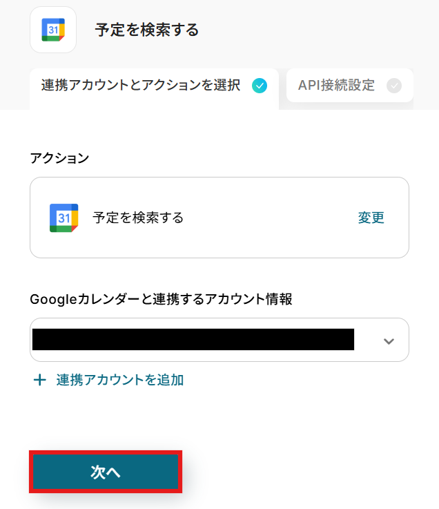 次に、Googleカレンダーで予定を検索するアクションの設定を進めていきましょう。