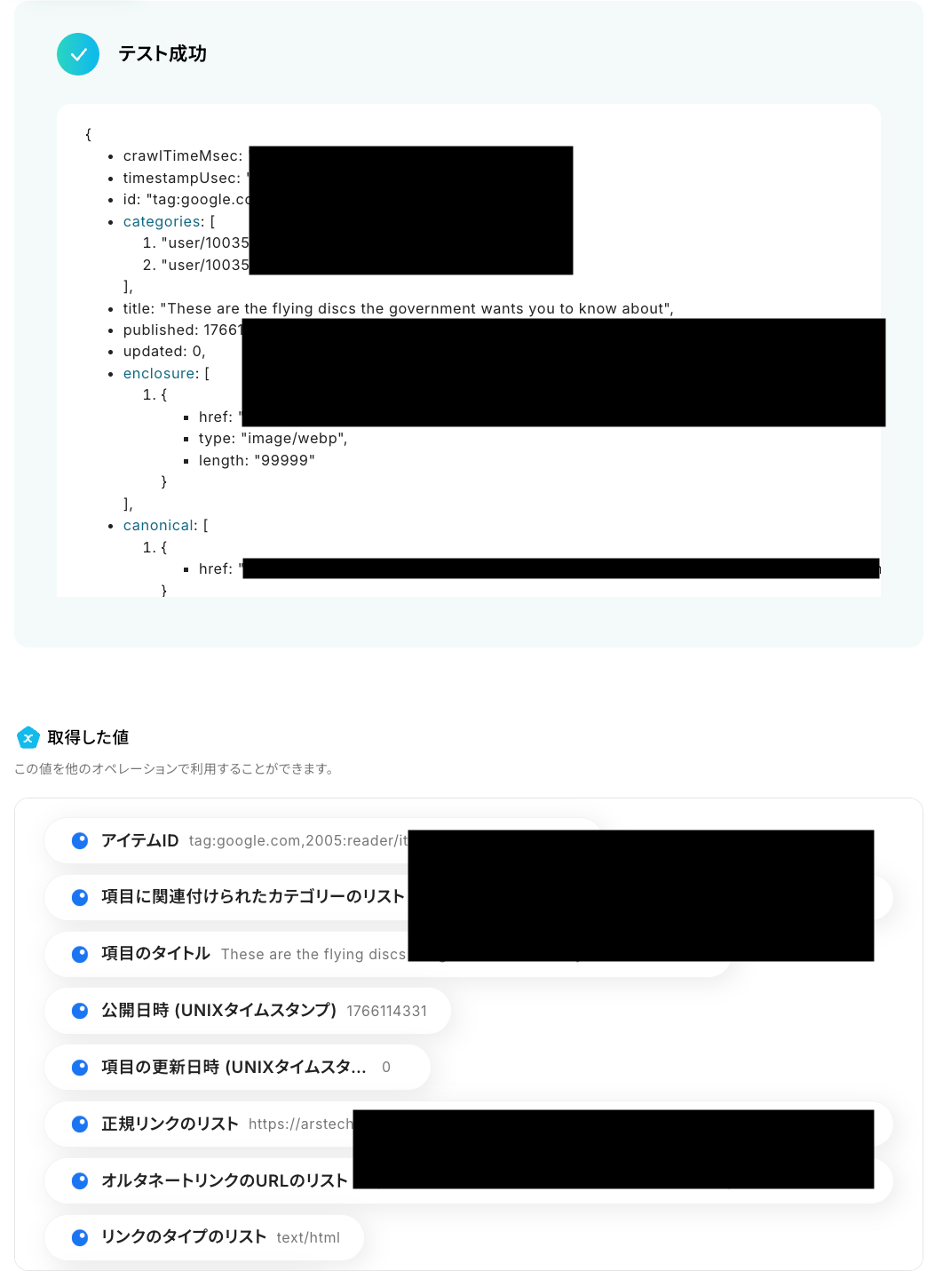 テストに成功すると、Inoreaderのフィードに公開されたコンテンツに関する情報が表示されます。