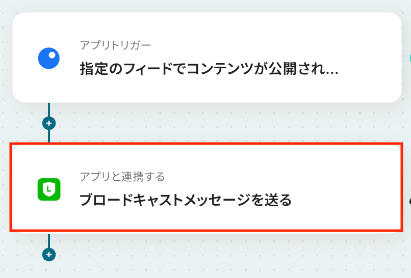 - 最後に、オペレーションでLINE公式アカウントの「ブロードキャストメッセージを送る」アクションを設定し、Inoreaderから取得した情報を送信します。