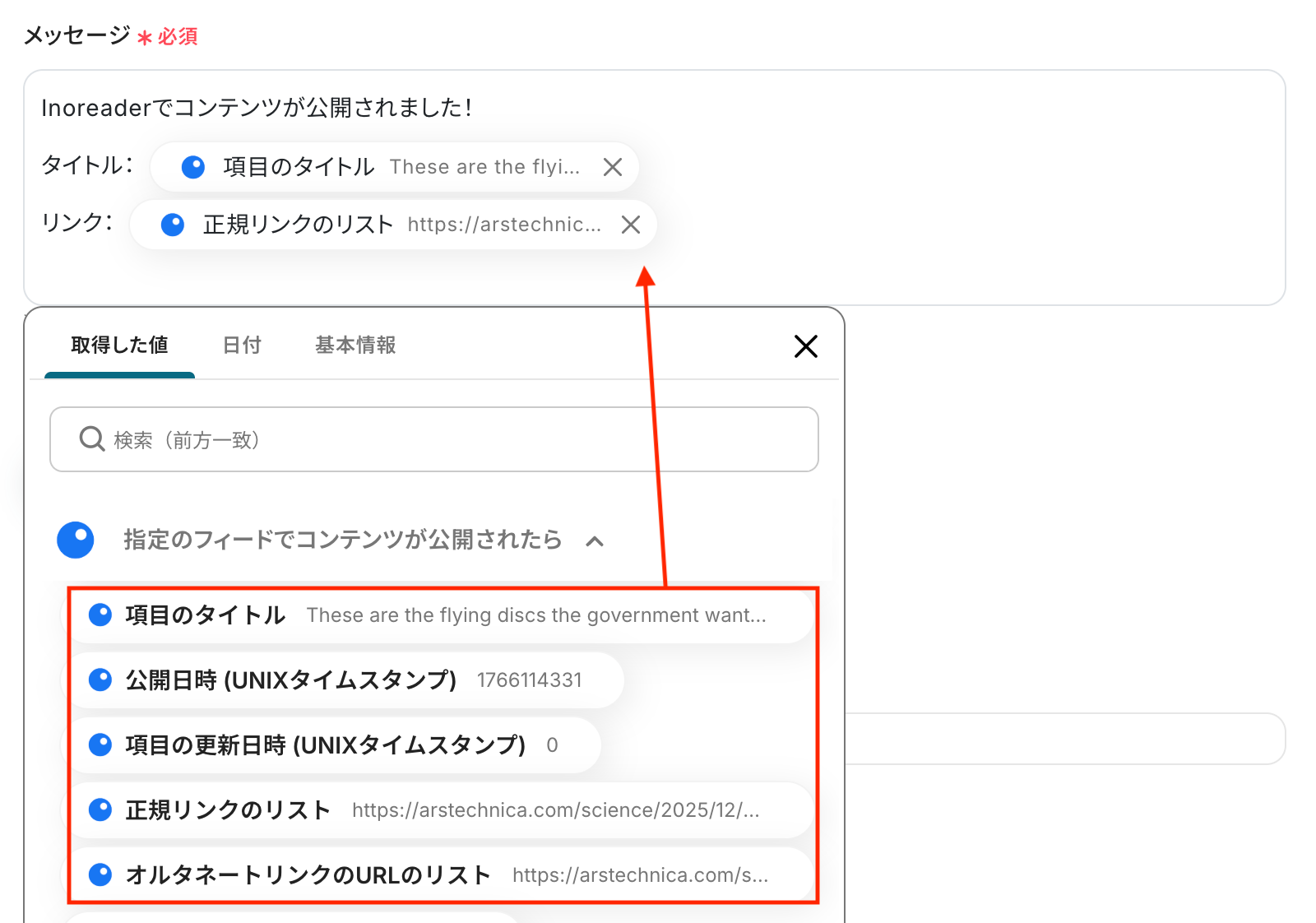 入力欄をクリックすると、前のステップでInoreaderから取得した値が表示されるので、選択して入力しましょう。