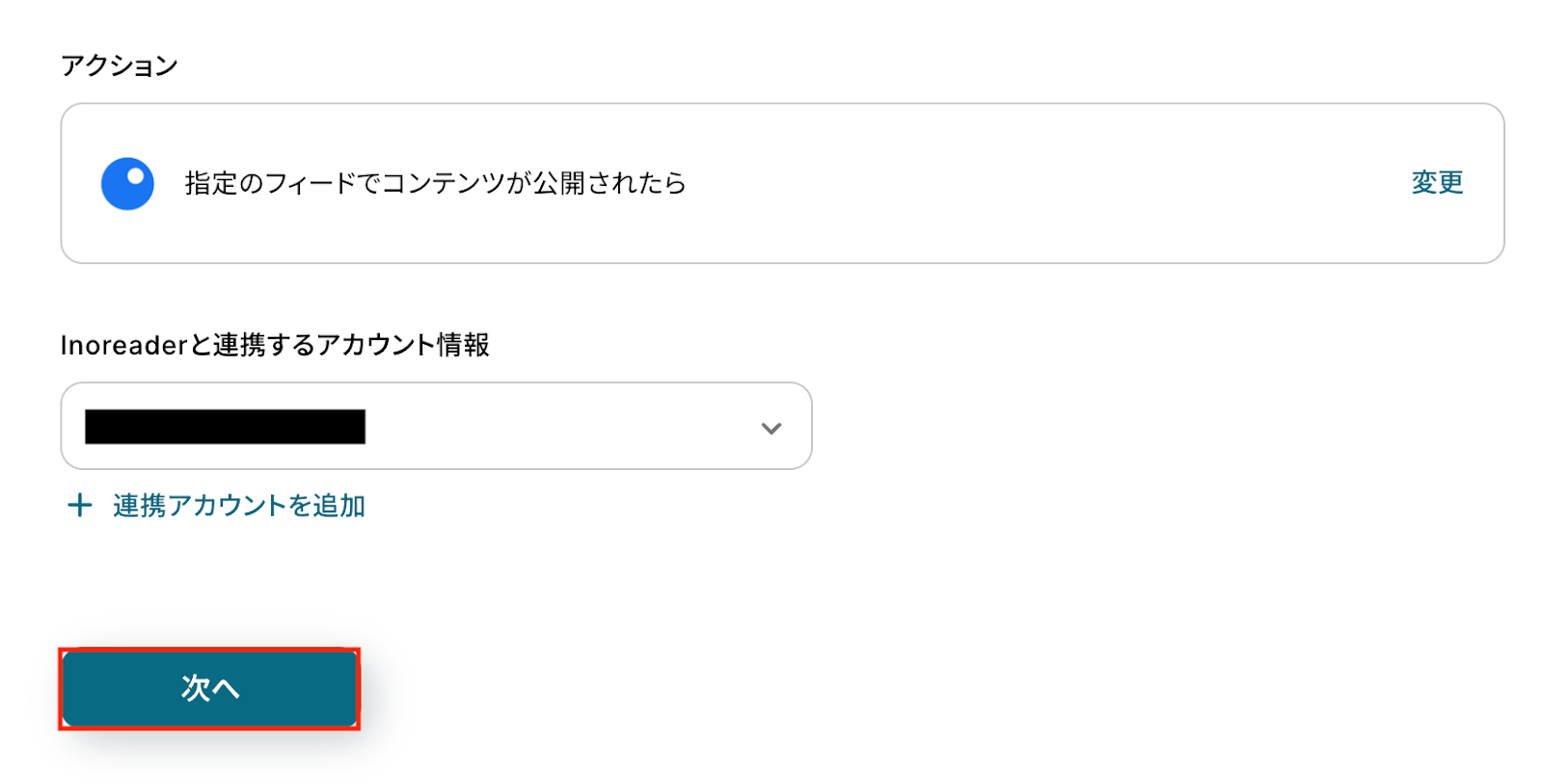 Inoreaderと連携するアカウント情報に問題がなければ、「次へ」をクリックします。