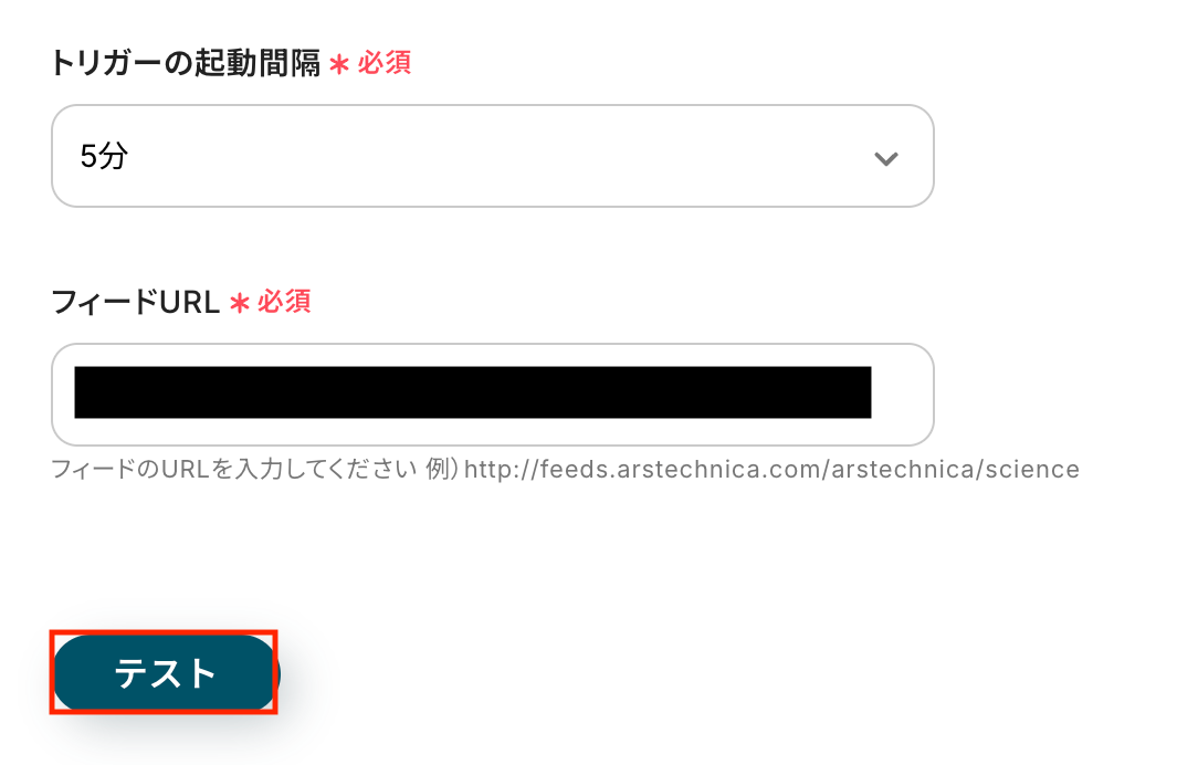 入力が完了したら、設定内容とトリガーの動作を確認するため「テスト」をクリックします。