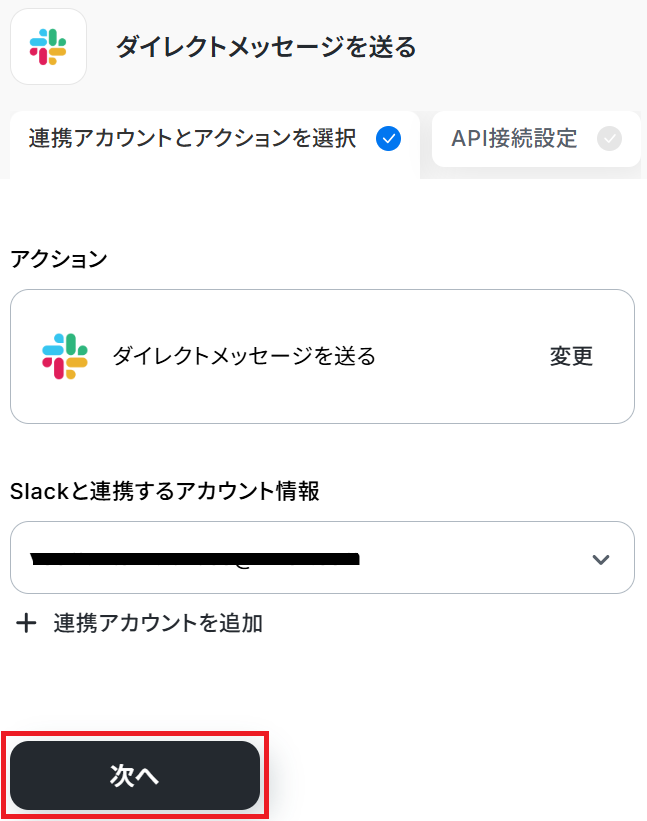 これまでのステップと同様、アクションは「ダイレクトメッセージを送る」のまま「次へ」をクリックします。