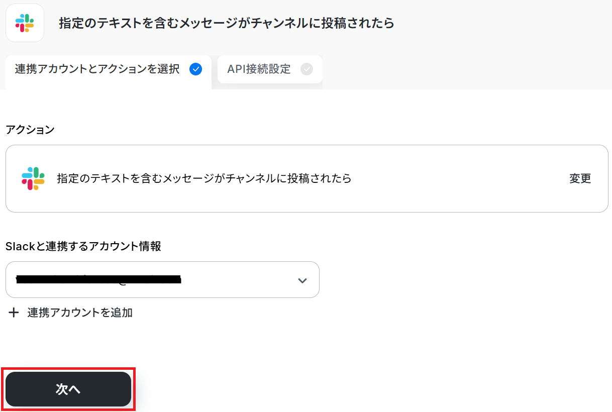 タイトル と連携するアカウント情報 を任意で設定し、アクションはテンプレート通りに「指定のテキストを含むメッセージがチャンネルに投稿されたら」のまま「次へ」をクリックします。