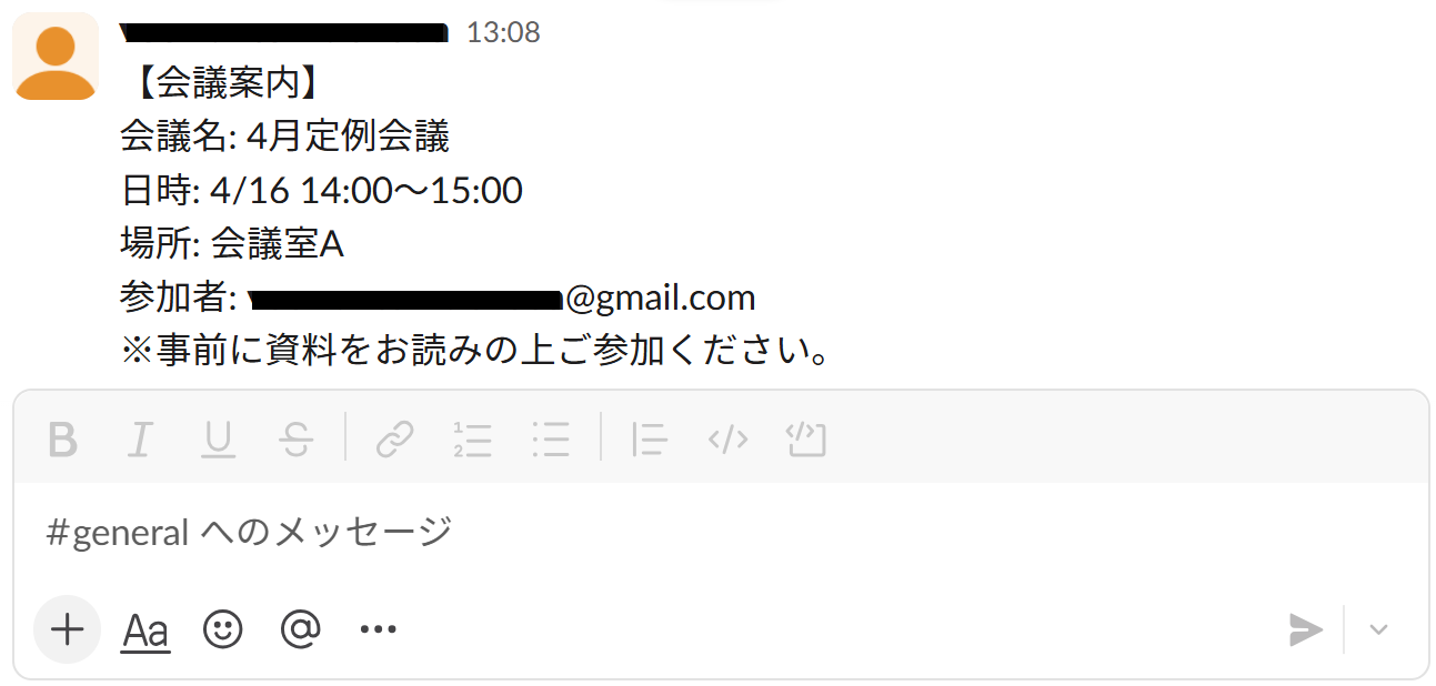 Slack上のメッセージを起点にカレンダー登録から通知までが自動化され、手作業の時間を短縮できます 手動での転記作業がなくなるため、日時や参加者の登録間違いといったヒューマンエラーの防止に繋がります