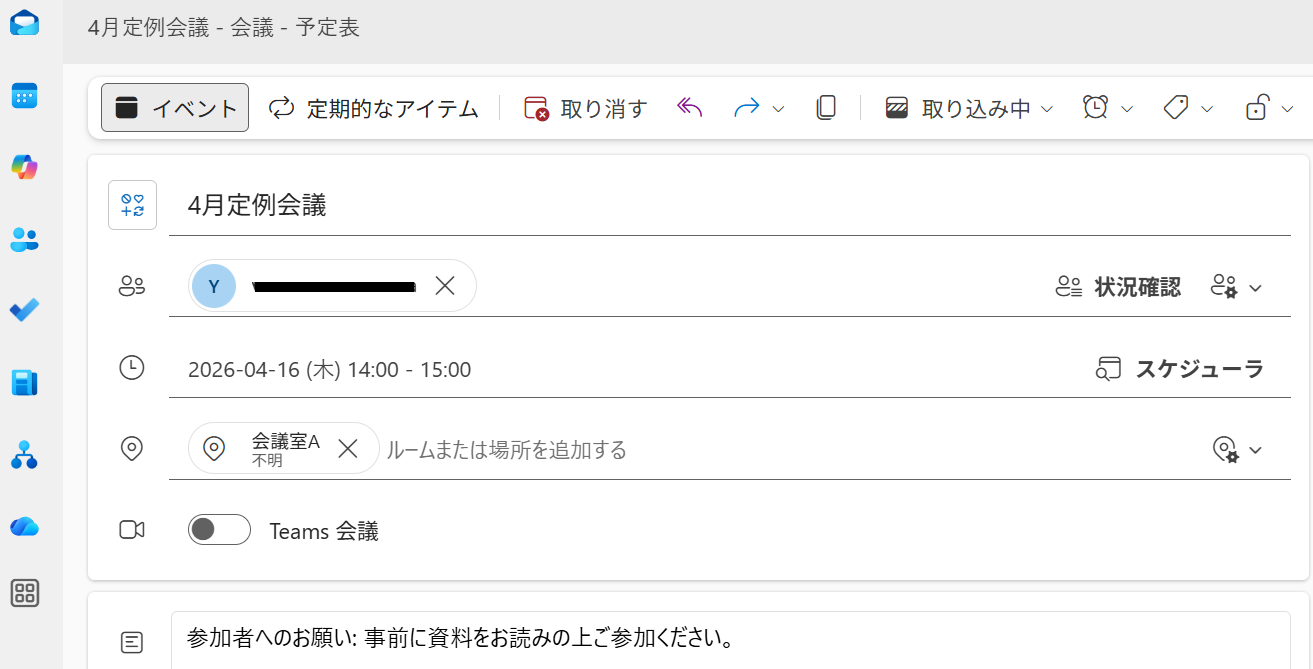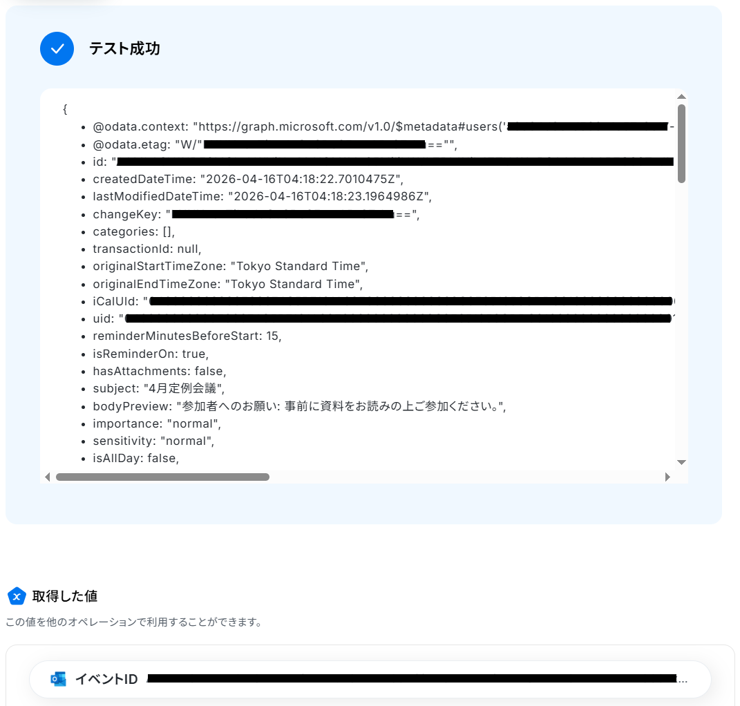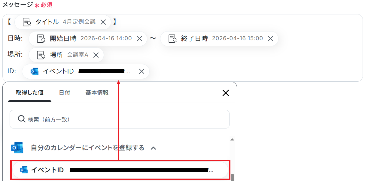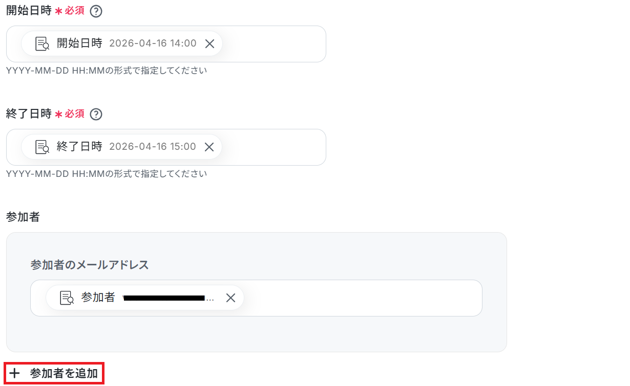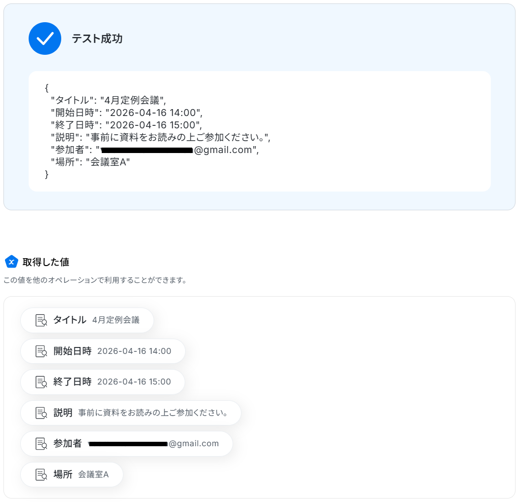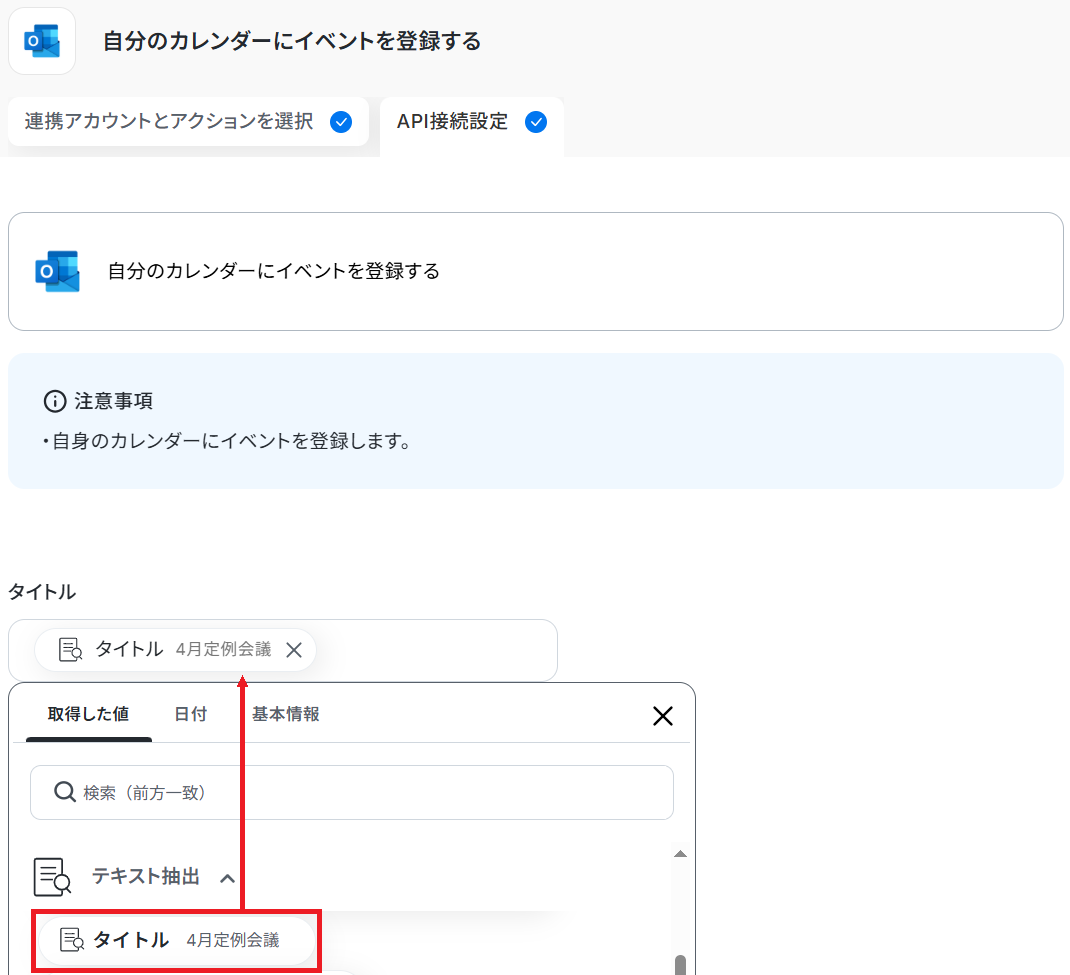 タイトル ・開始日時 ・終了日時 ・参加者 の欄には、それぞれテキスト抽出機能から取得した値が既に設定されているのでそのままでOKです。