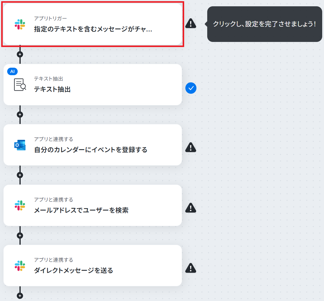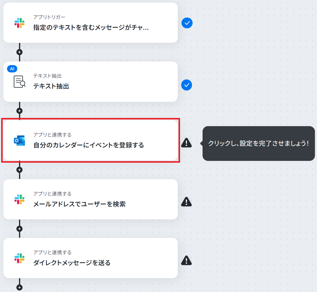 はじめに、SlackとOutlookをYoomと連携します 次に、トリガーでSlackを選択し、「指定のテキストを含むメッセージがチャンネルに投稿されたら」というアクションを設定します 次に、オペレーションで、テキスト抽出機能を設定し、投稿されたメッセージから会議の日時や参加者などの情報を抽出します 次に、オペレーションで、Outlookの「自分のカレンダーにイベントを登録する」アクションを設定し、抽出した情報を紐付けます 最後に、オペレーションでSlackのアクションを設定し、参加者へダイレクトメッセージでイベントの詳細を通知します ※「トリガー」:フロー起動のきっかけとなるアクション、「オペレーション」:トリガー起動後、フロー内で処理を行うアクション