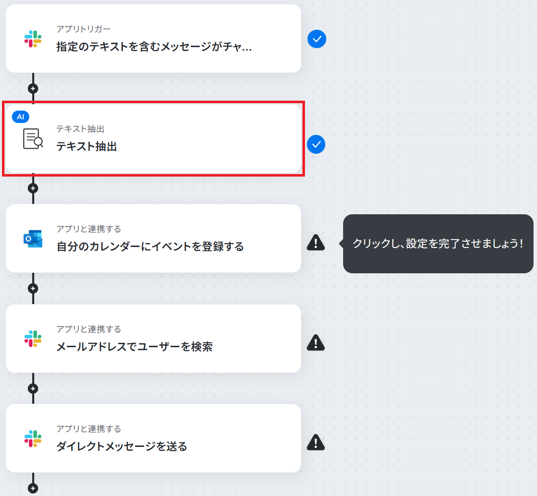ステップ4:テキスト抽出設定 先ほど取得した投稿内容から、スケジュール登録に必要な項目を抽出します。 「テキスト抽出」をクリックしましょう。