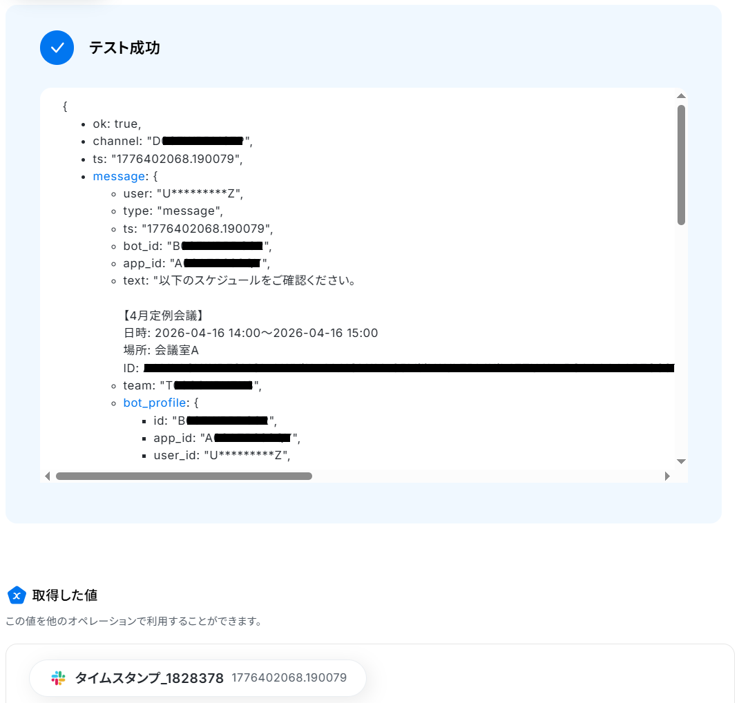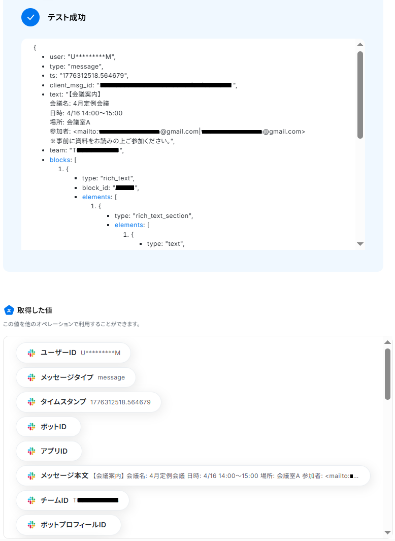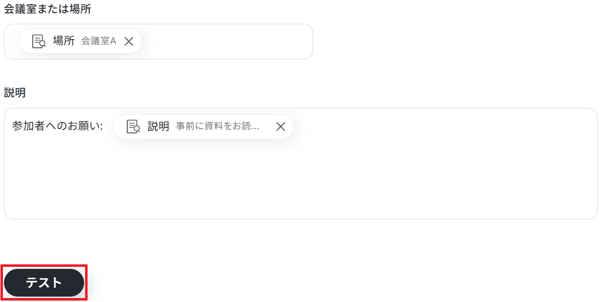 以下の説明 欄のように、取得した値と固定のテキストを組み合わせてカスタマイズすることも可能です。 設定が完了したらテストしましょう。