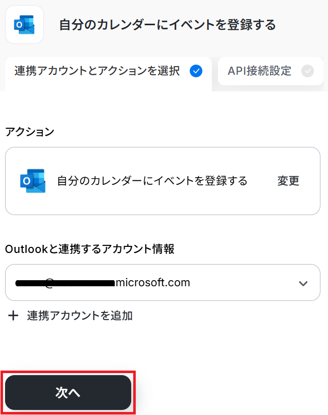 ステップ3と同様、アクションは「自分のカレンダーにイベントを登録する」のまま「次へ」をクリックします。