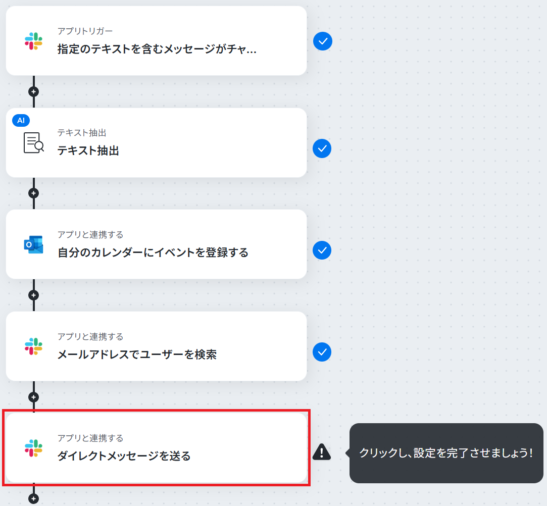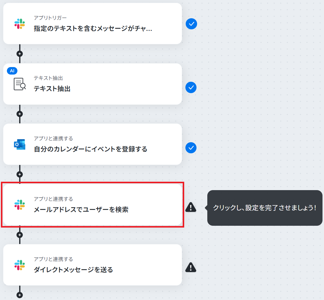 ステップ6:Slackでユーザーを検索する設定 ステップ4で抽出したメールアドレスをもとに、DM送信対象のユーザーを検索します。 「メールアドレスでユーザーを検索」をクリックしましょう。