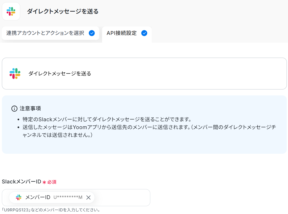 SlackメンバーID の欄には、ステップ6で取得した「メンバーID」の値が既に設定されているのでそのままで大丈夫です。