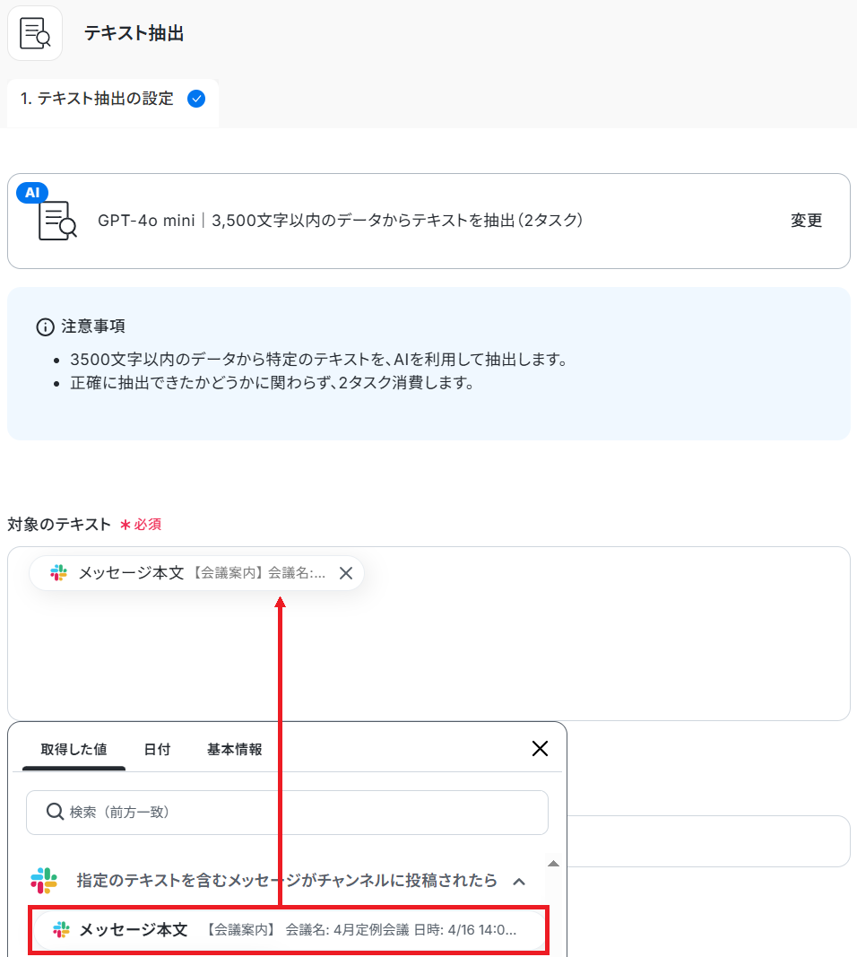 対象のテキスト の欄には、Slackから取得した「メッセージ本文」の値が予め設定されているのでそのままで大丈夫です。