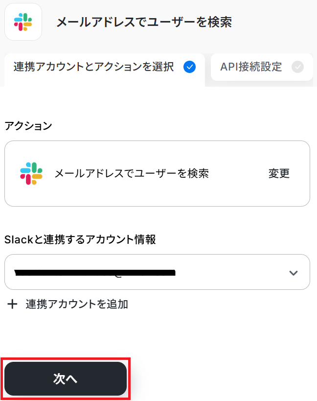 ステップ3・5と同様、アクションは「メールアドレスでユーザーを検索」のまま「次へ」をクリックします。