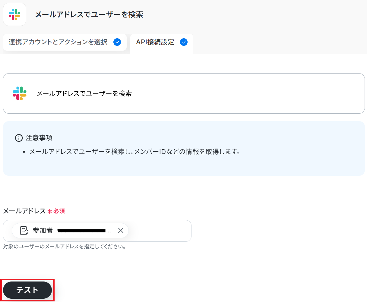 ステップ5と同じく、メールアドレス の欄にはテキスト抽出機能から取得した「メールアドレス」の値が予め設定されているのでそのままテストしてください。