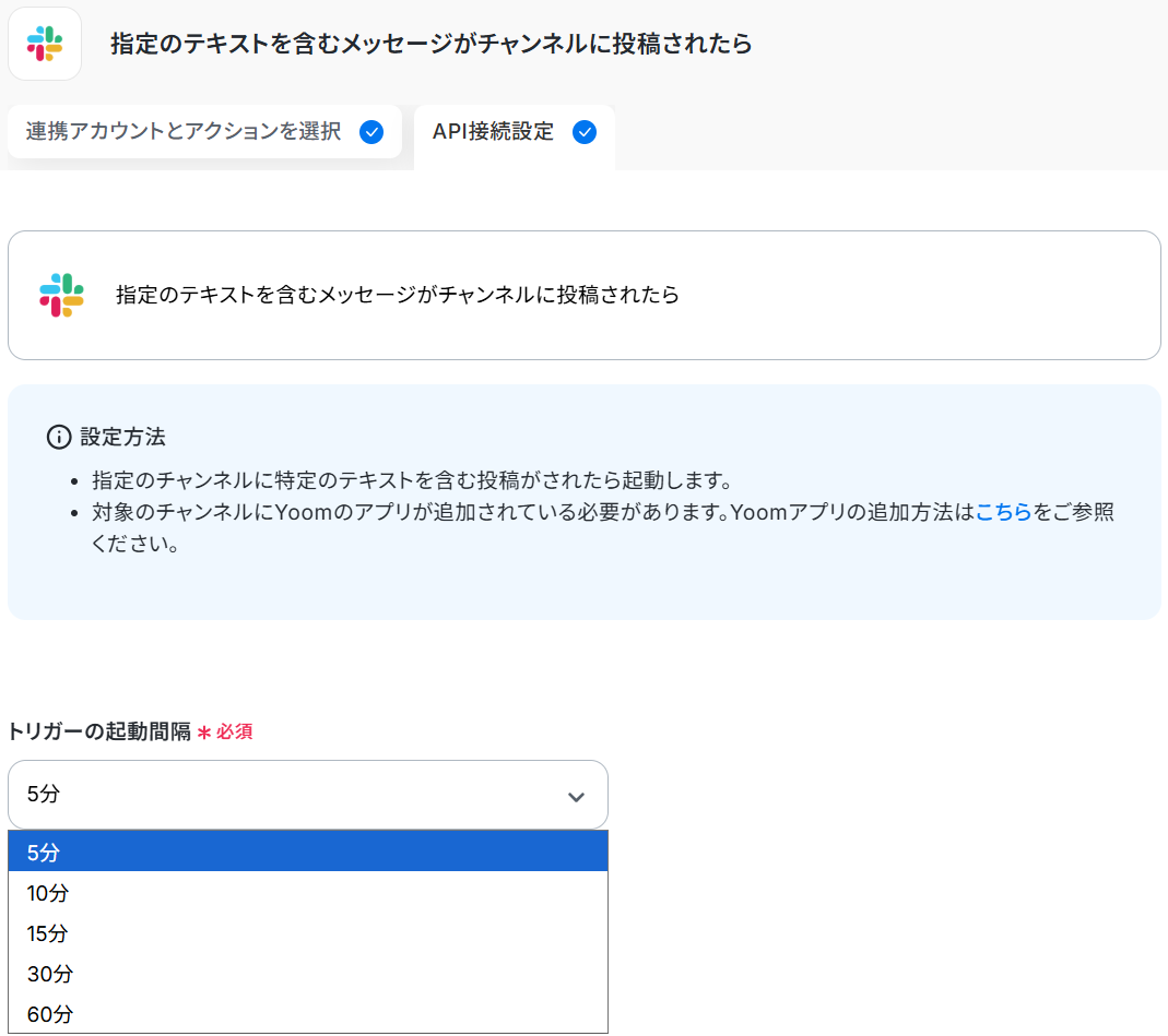 SlackとGoogleドキュメントのそれぞれとYoomを連携してください。 トリガーは5分、10分、15分、30分、60分の間隔で起動間隔を選択できます。 プラン によって最短の起動間隔が異なりますので、ご注意ください。