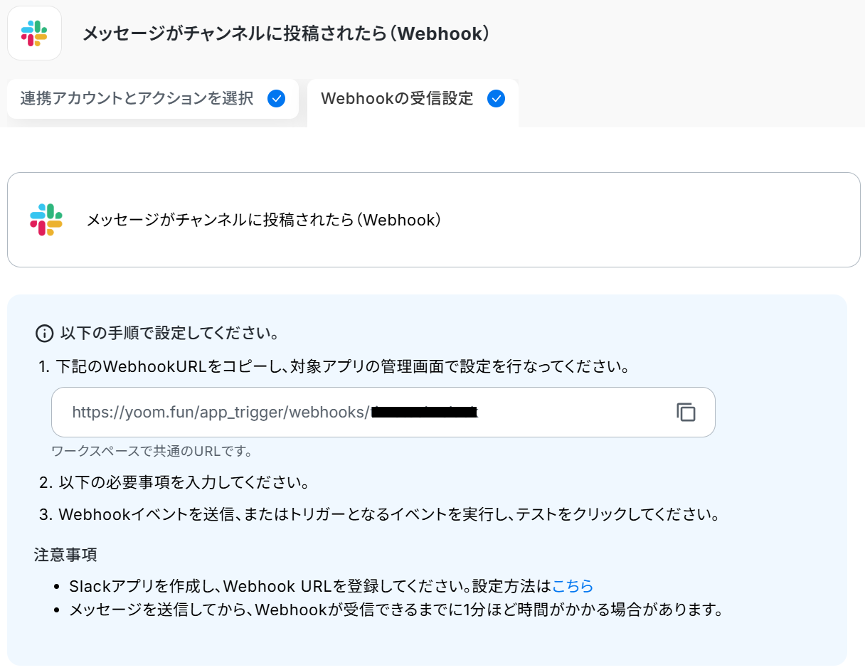 ステップ3:Slackのトリガー設定 「メッセージがチャンネルに投稿されたら(Webhook)」をクリックしてください。