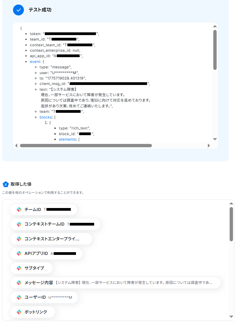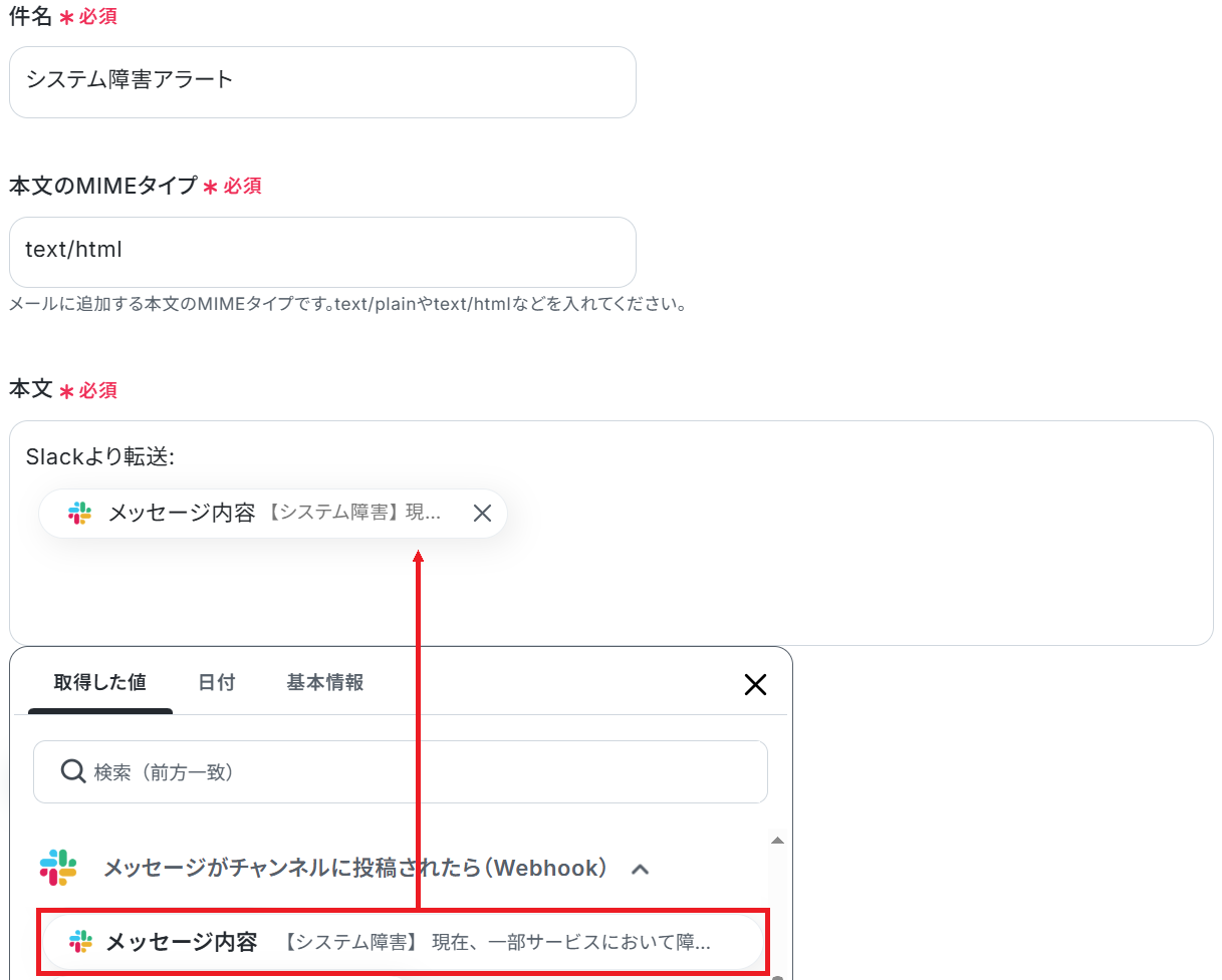 続けて、件名 ・本文のMIMEタイプ (text/plainやtext/htmlなど)・本文 を入力しテストしてください。 件名や本文は、Slackから取得した値や固定のテキストを組み合わせて自由にカスタマイズ可能です。 以下のように取得した値を設定することで、トリガーが実行されるたびに最新の投稿内容を反映できます。