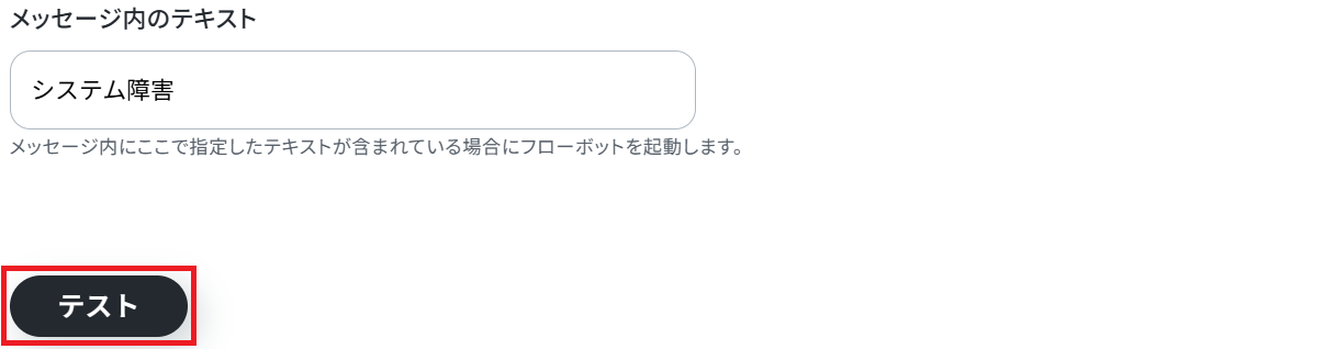 メッセージ内のテキスト …特定のキーワードを含むメッセージのみをフローボットの起動対象にできます。テキストを入力してください。