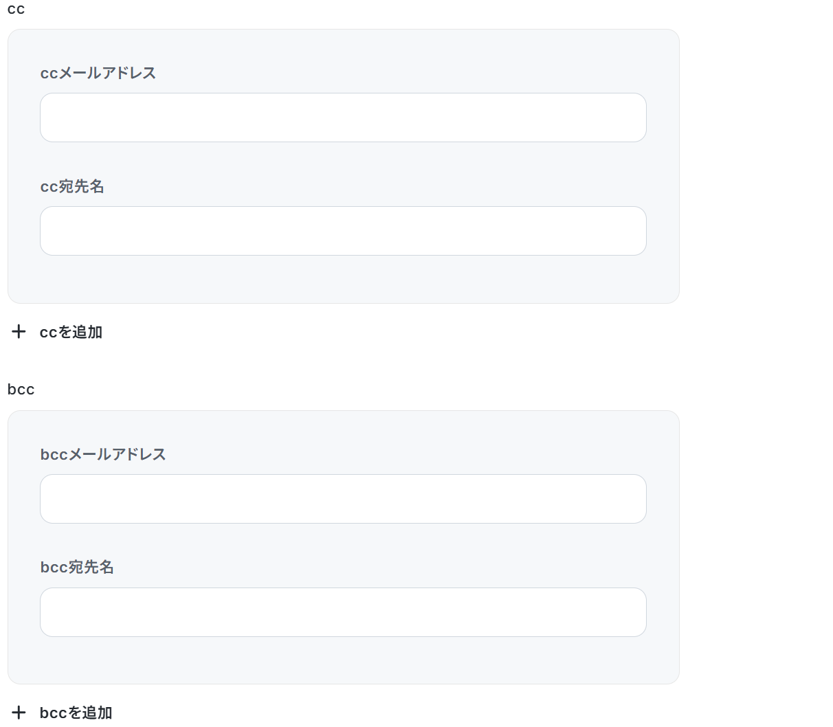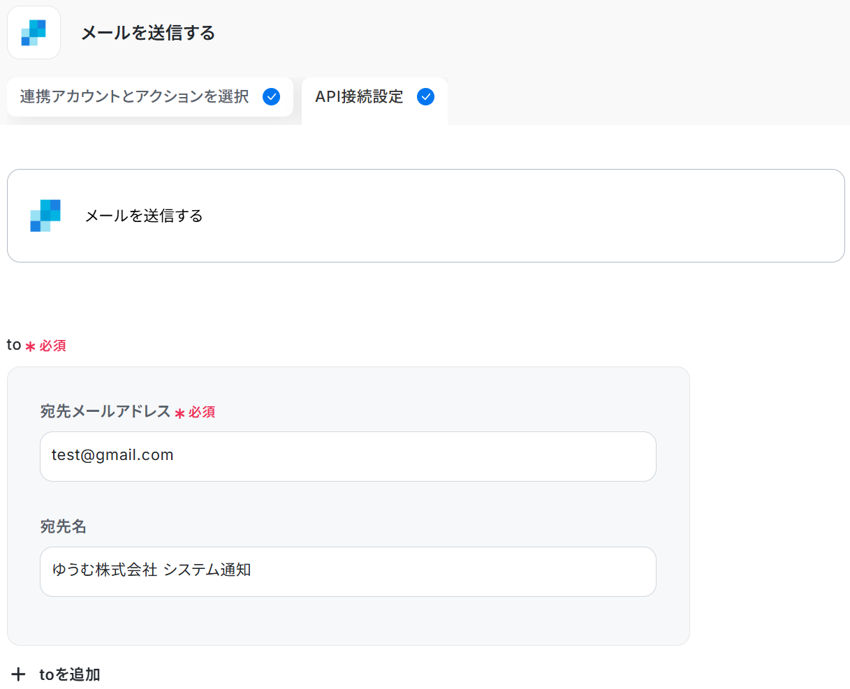 まず、to の宛先メールアドレス を入力しましょう。任意で宛先名 も設定できます。